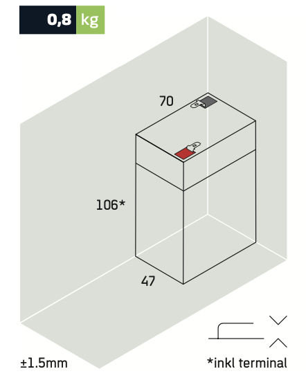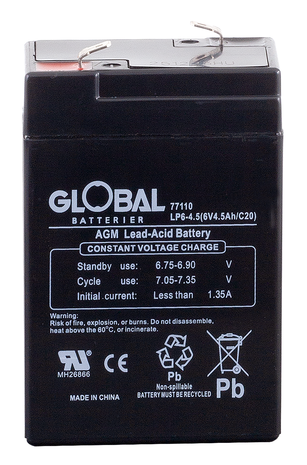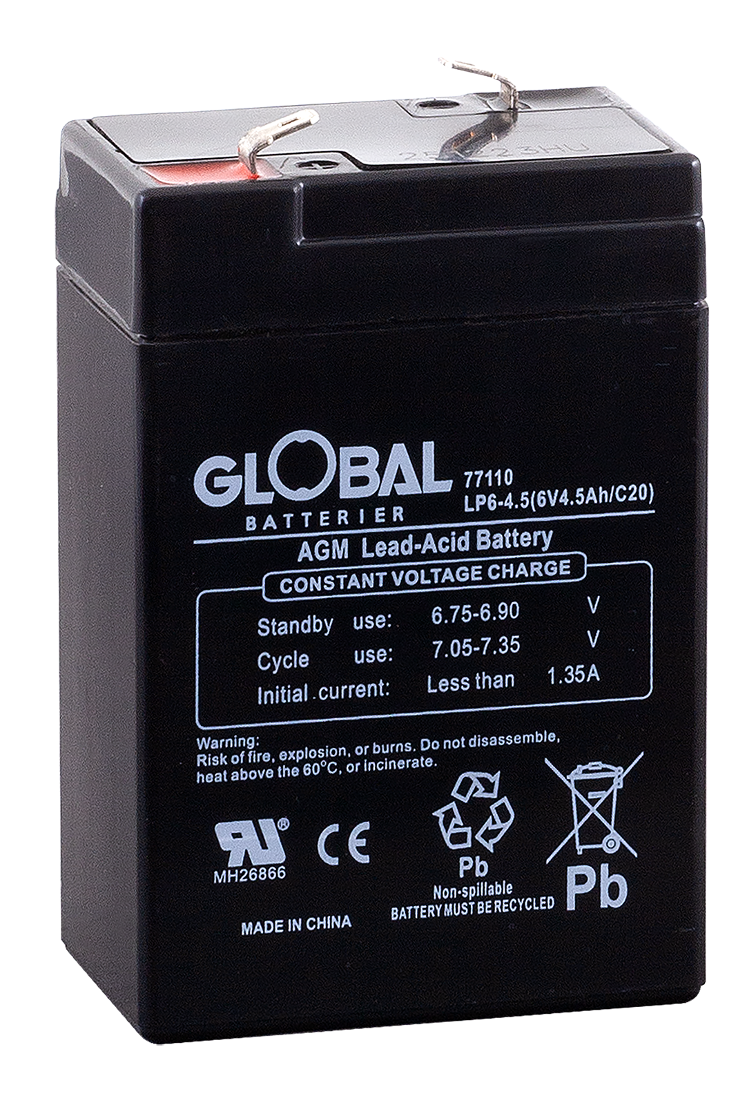 Global LP6-4,5 är ett pålitligt och högpresterande AGM-batteri (Absorbent Glass Mat), tillverkat av högkvalitativa material. Den avancerade AGM-tekniken gör batteriet underhållsfritt och helt läckagesäkert. Flexibel design möjliggör montering i flera positioner, inte enbart vertikalt.