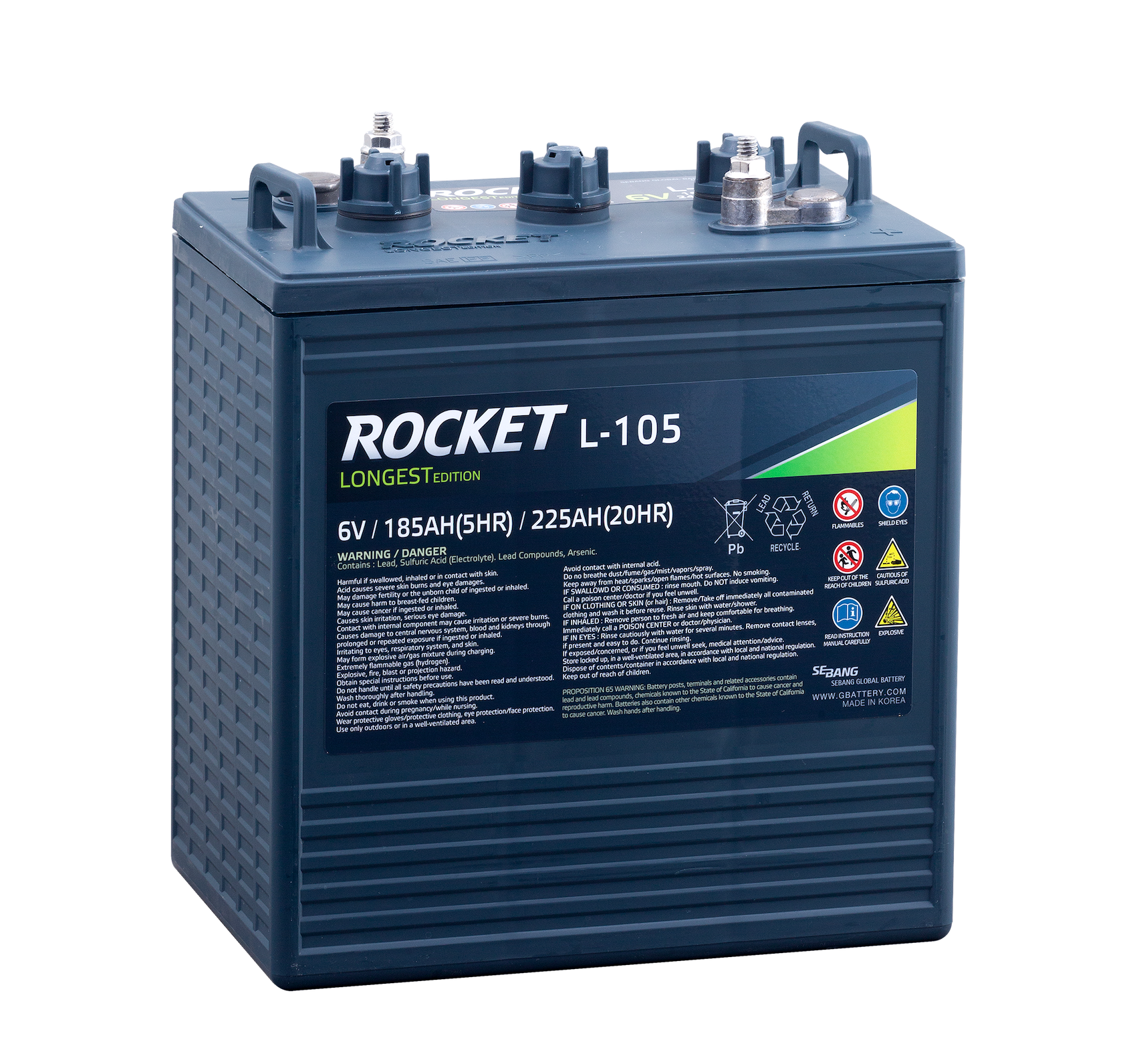 Rocket L-105-LE är ett kraftfullt och robust öppet blybatteri , idealiskt för utrustning där hög driftsäkerhet krävs. Våtcellsdesignen är konstruerad för att regelbundet fylla på med nytt batterivatten, vilket vilket krävs för denna typ av batteri.