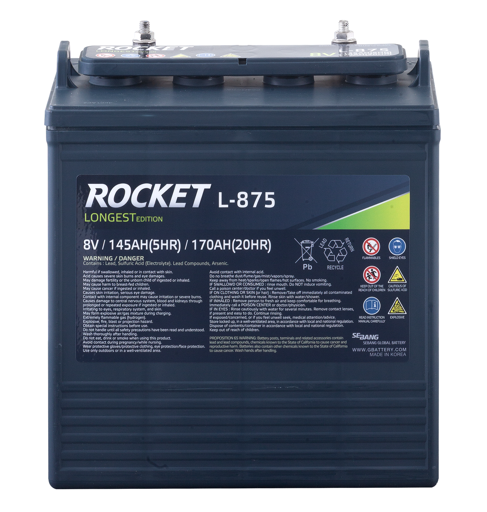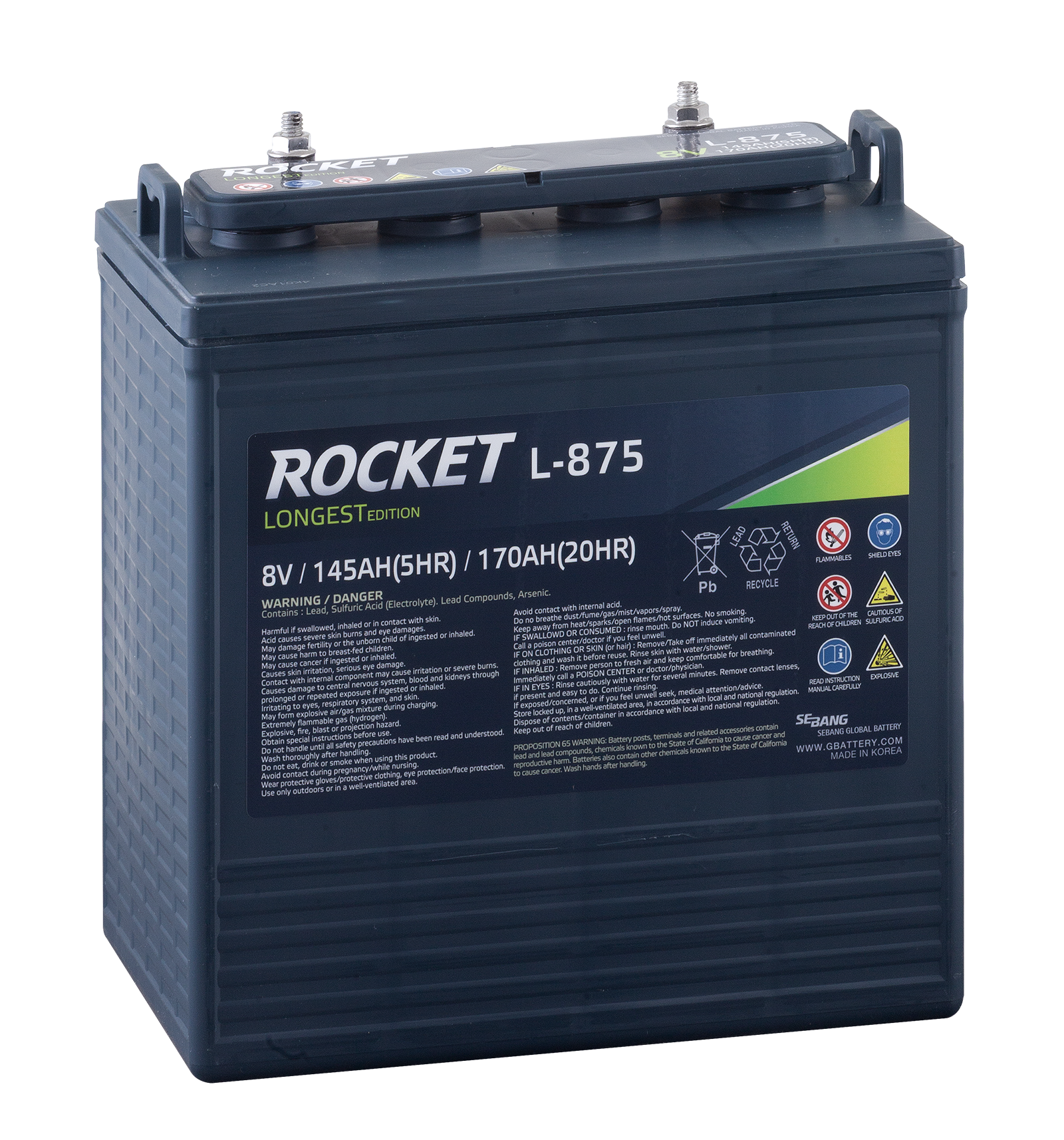 Rocket L-875-LE är ett kraftfullt och robust öppet blybatteri , idealiskt för utrustning där hög driftsäkerhet krävs. Våtcellsdesignen är konstruerad för att regelbundet fylla på med nytt batterivatten, vilket vilket krävs för denna typ av batteri.