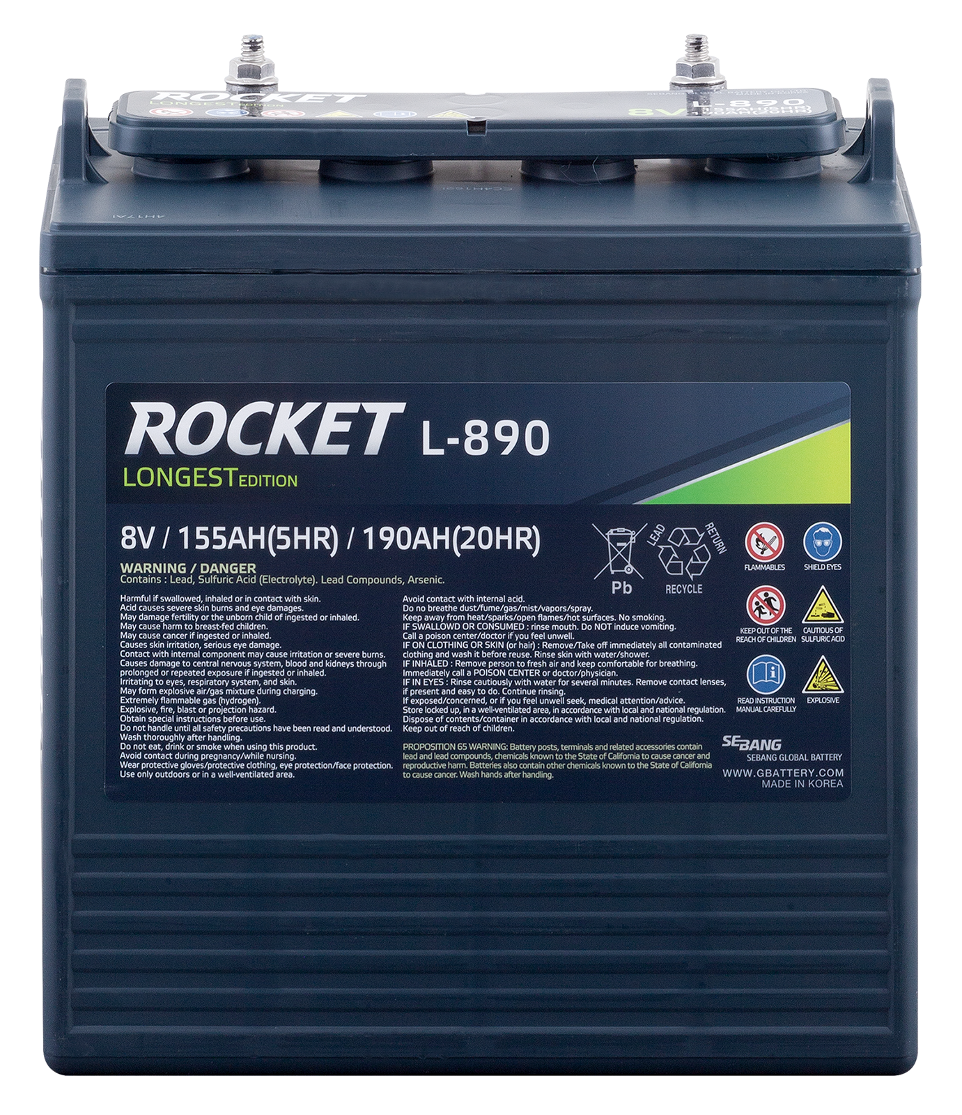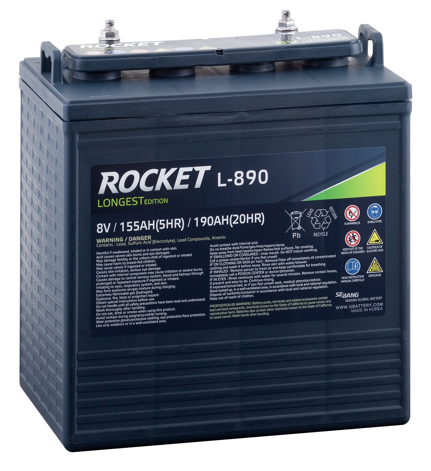 Rocket L-890 är ett kraftfullt och robust öppet blybatteri 8V 190Ah, idealiskt för utrustning där hög driftsäkerhet krävs. Den klassiska våtcellsdesignen är konstruerad för att regelbundet fylla på med nytt batterivatten, vilket vilket krävs för denna typ av batteri.