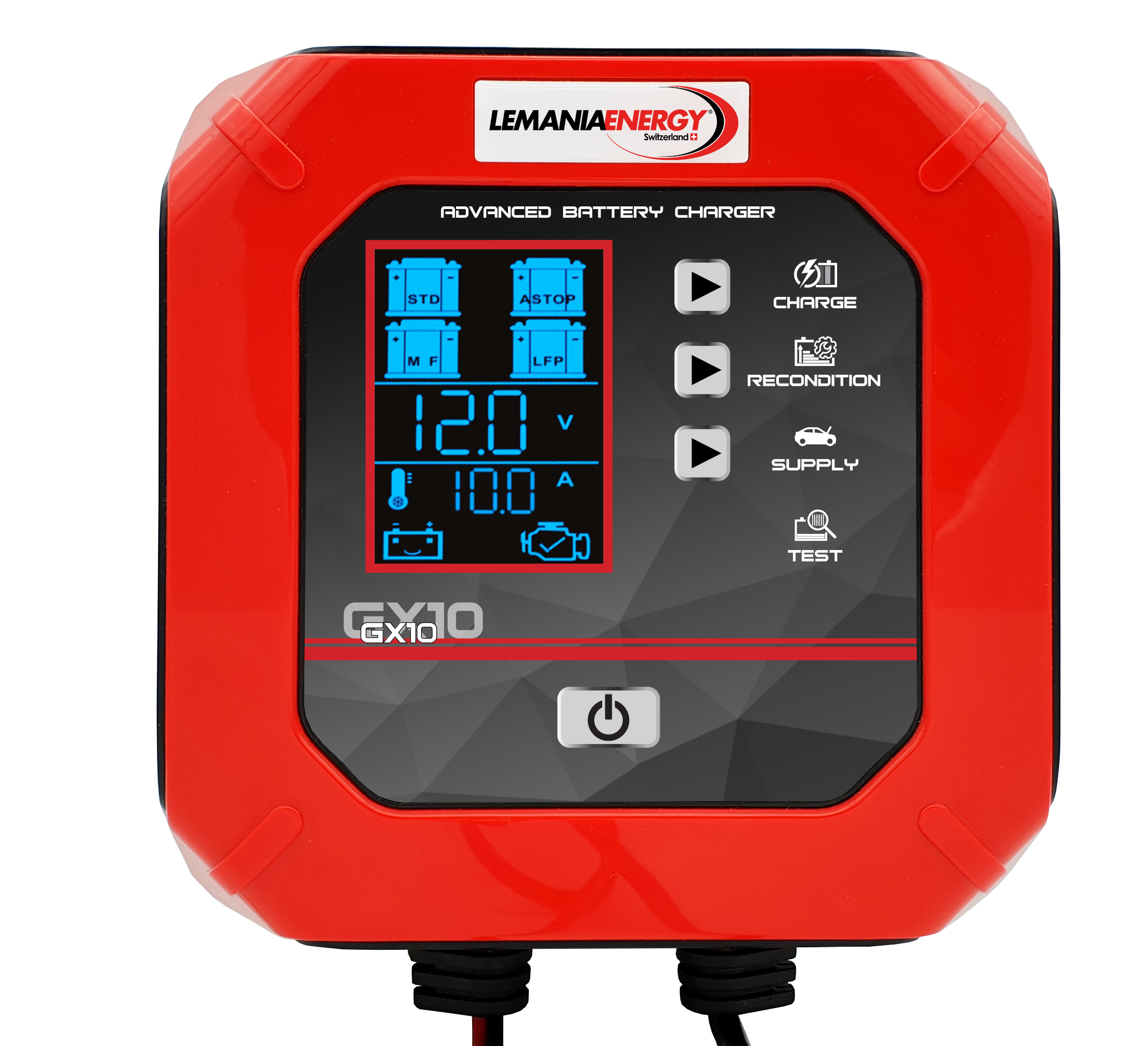 GX10 har gnistskydd, polaritetsskydd och ett automatiskt underhållsläge som håller batteriet fulladdat utan risk för överladdning. Den är dessutom utrustad med testfunktion för både batteri och generator, vilket gör den till ett praktiskt verktyg vid service och felsökning.