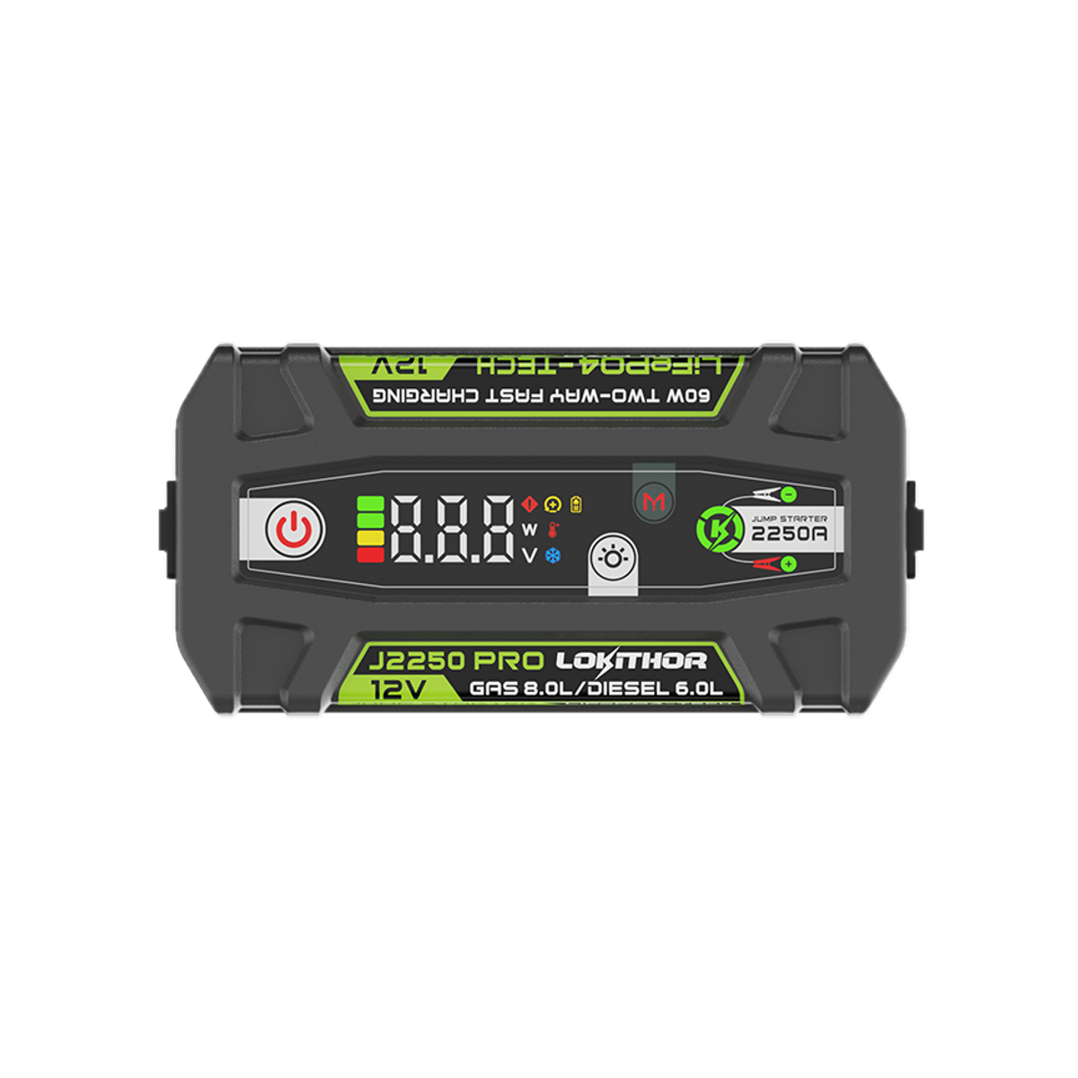 Lokithor J2250 PRO Booster levererar upp till 2250A, vilket möjliggör snabba starter för bensin- och dieselmotorer, även i extrema temperaturer.